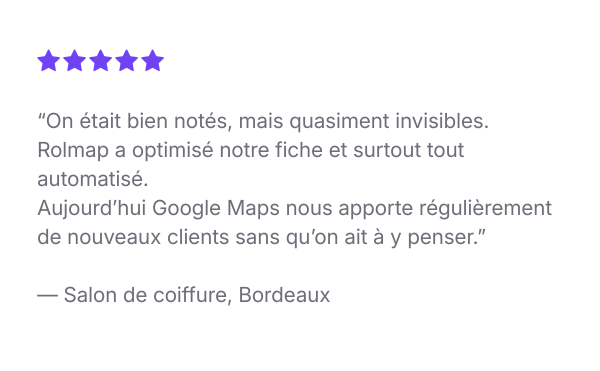 Rolmap optimise votre fiche Google Maps pour vous faire apparaître avant vos concurrents lorsque des clients vous recherchent.